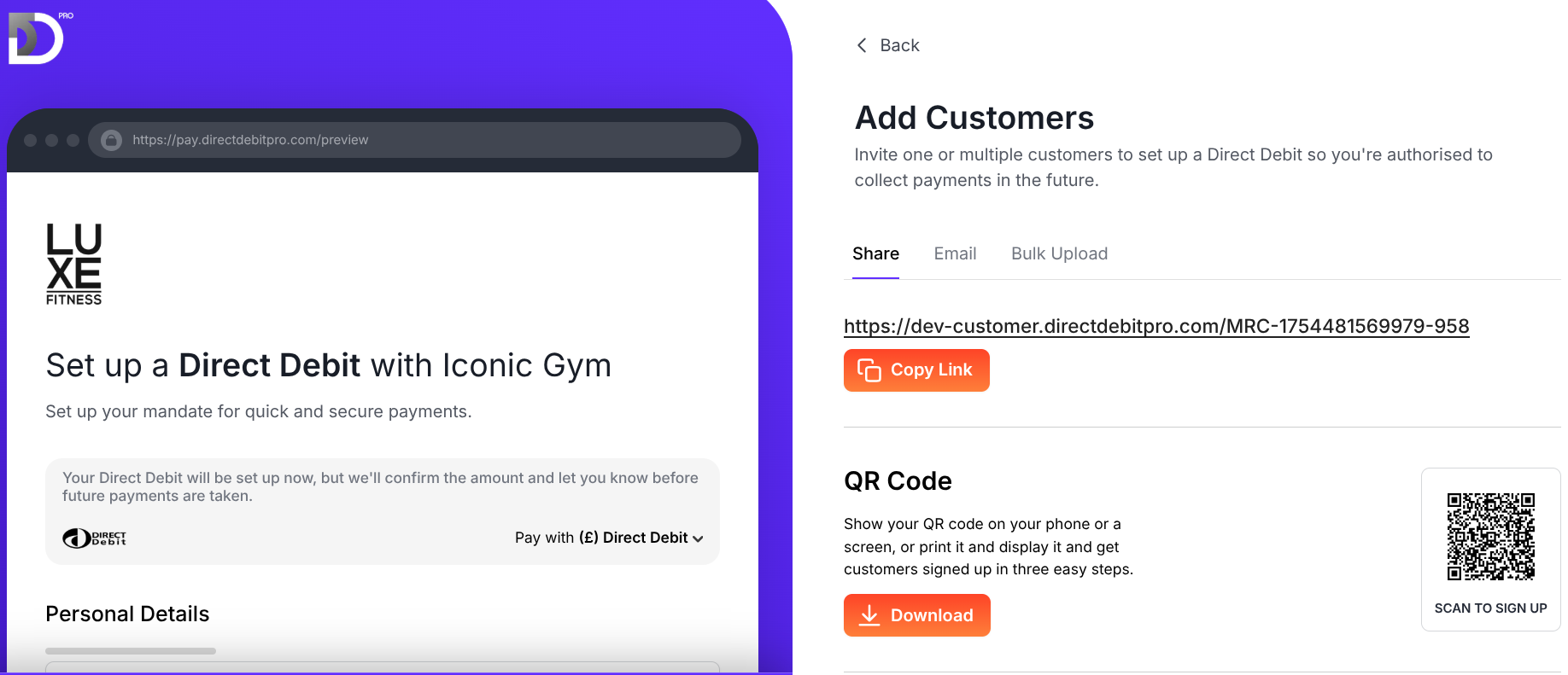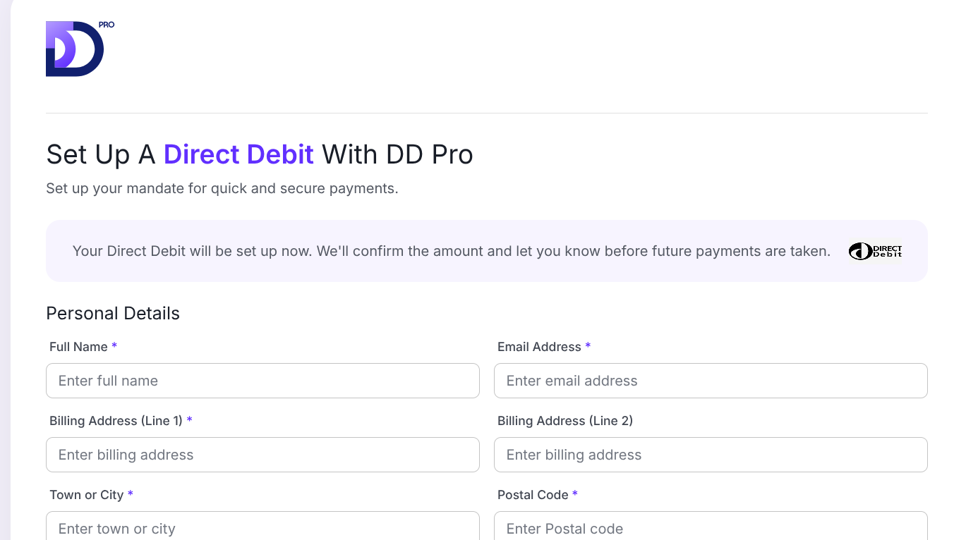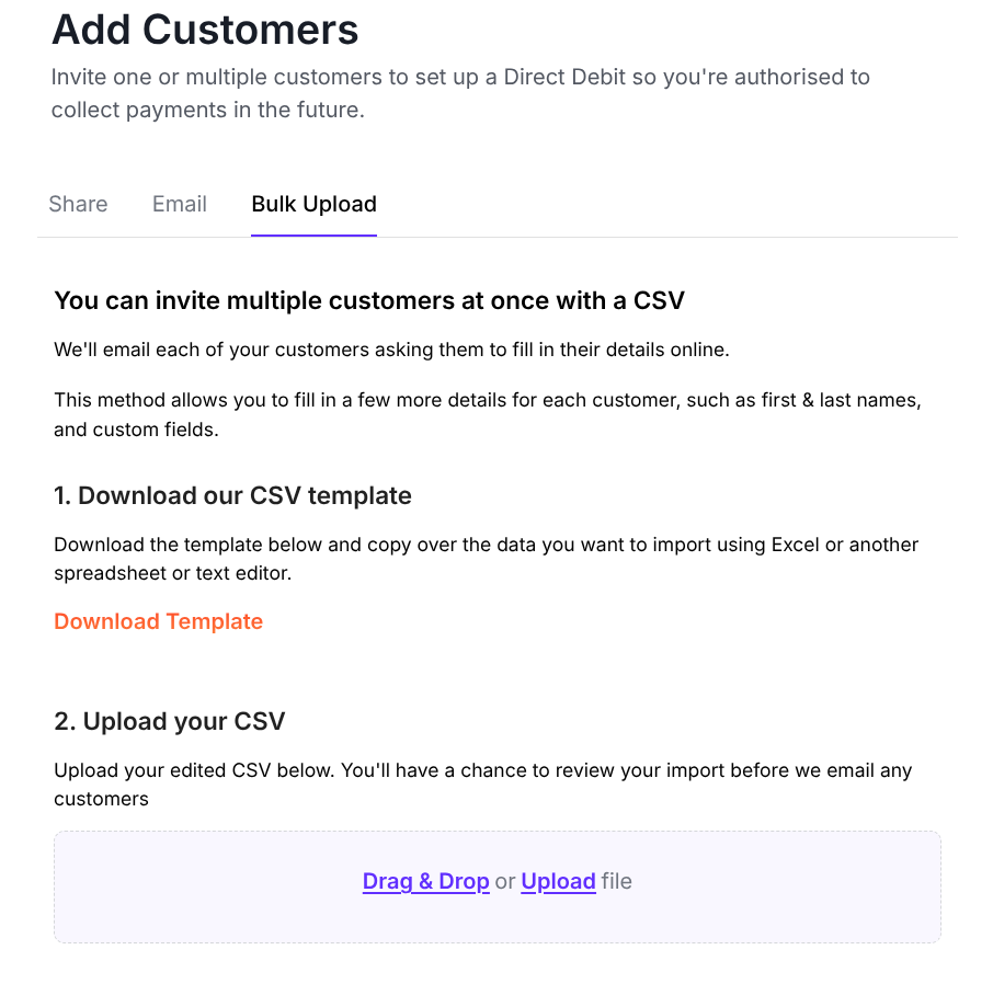 Do you have multiple customers to sign up in one go but don't want to send out 50 or maybe even 100 individual emails? Let us save you some time. Download our template, add your customers details, upload, review and let us send the emails to invite your customers to sign their DD mandate. Once complete, our system will automatically add their information to DD Pro.
