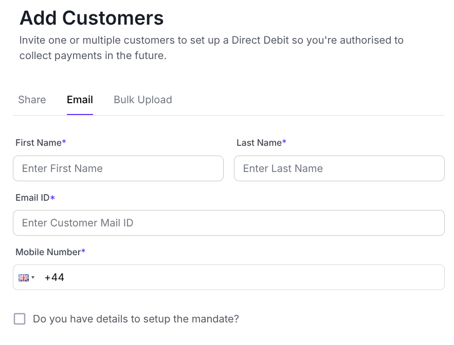 Already have some of the customers information to hand? No problem, enter their name, email address and phone number and we will send the email for you containing the mandate