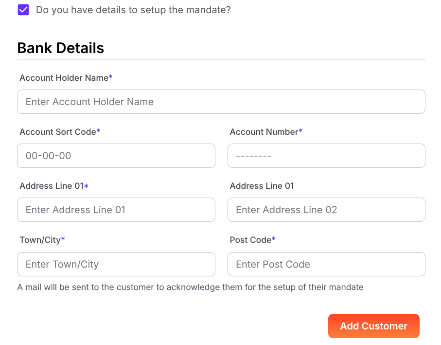 Have the bank details, address and the customers authorisation already? No problem, click on the tick box to say you have the information and complete below, then press add customer for the information to be stored in DD pro. Our system will automatically send a welcome letter to your customer confirming the setup of the Direct Debit.