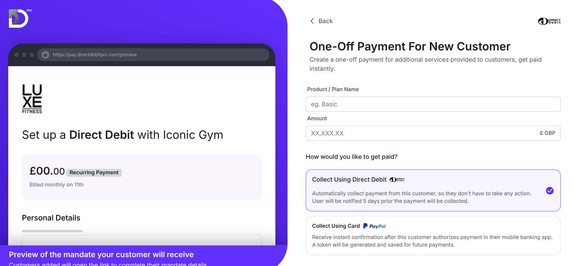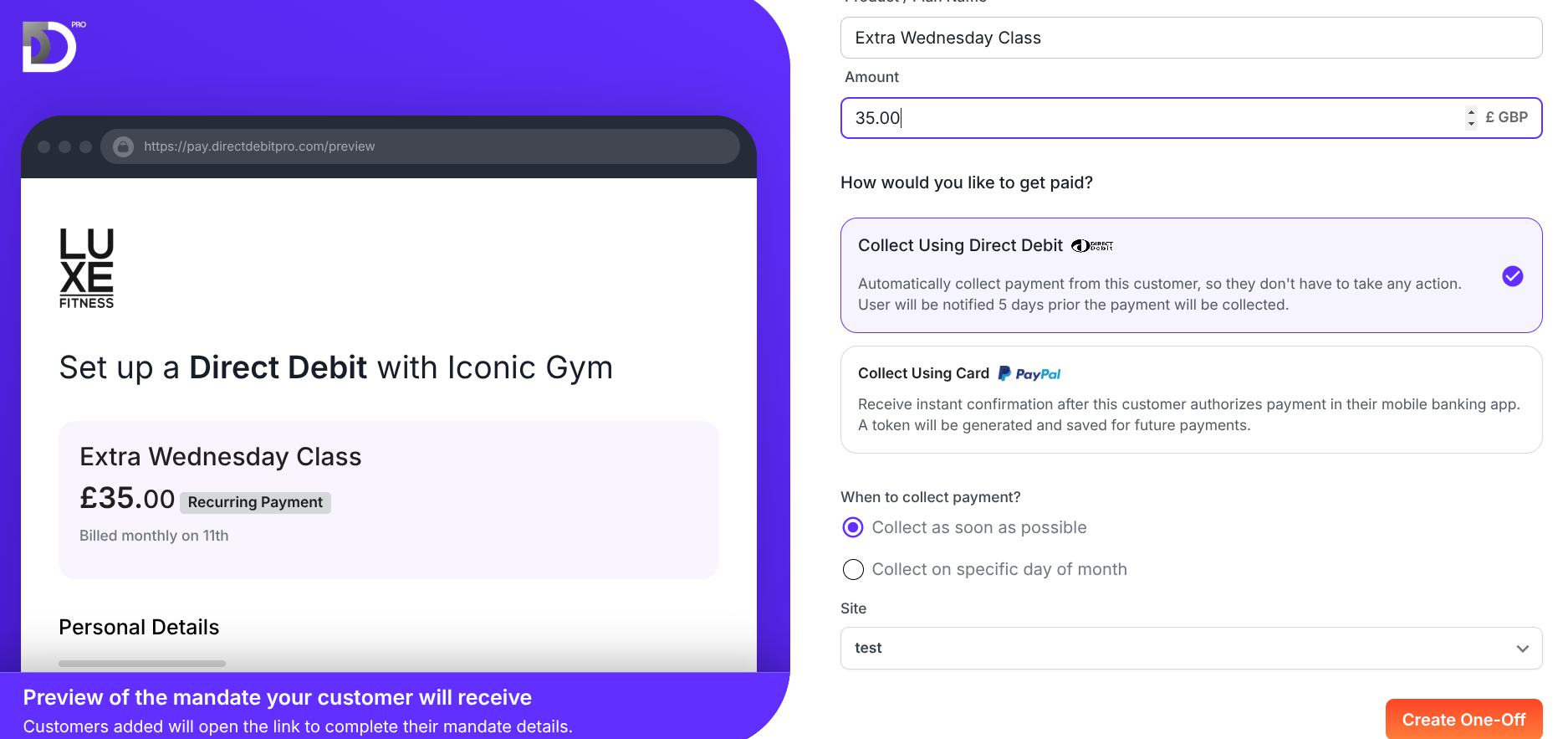 Want to collect a one off payment by Direct Debit or card? Click one-off payment