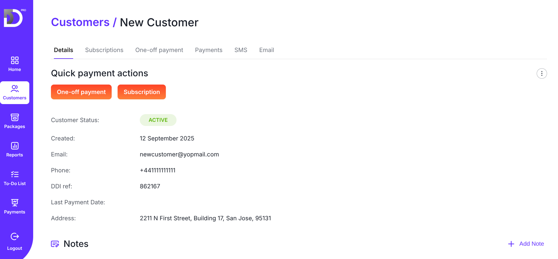Use the details tab to give you an overview of the info you hold for the customer on DD Pro. Add notes to the individual customer for your own records.
